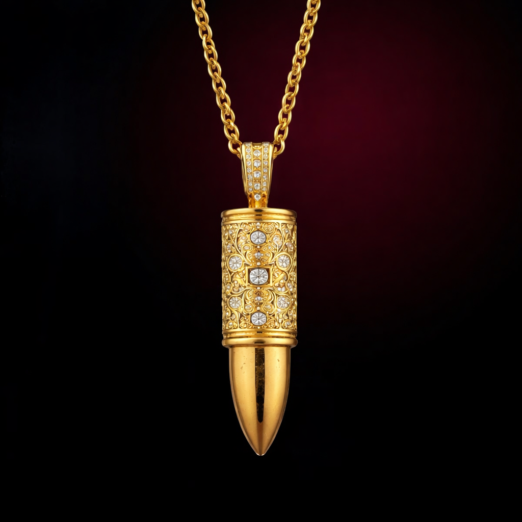 Ce collier doré se compose d’une chaîne épaisse aux maillons arrondis, lourds et réguliers. Le pendentif, avec une partie inférieure lisse et brillante, qui se termine en pointe douce. La partie supérieure est cylindrique et richement ornée de motifs gravés en relief. De petites pierres transparentes sont incrustées harmonieusement sur toute cette zone décorée. L’ensemble évoque un bijou luxueux, structuré et élégant, avec un fort contraste entre la simplicité des surfaces lisses et la finesse des détails décoratifs.